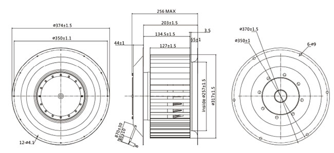 单进风前倾式离心风机根据风机外形可分为蜗壳前倾式离心风机和常规前倾式离心风机两种。蜗壳前倾式离心风机共有120mm、133mm、140mm、150mm、160mm、180mm等六种。常规前倾式离心风机有200mm、225mm、250mm、280mm、315mm、355mm、400mm、450mm等八种。