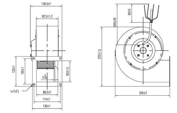 ①性能参数:风轮直径为150mm,由4极额定电压为230V,频率50/60Hz的单相电容电机组成,额定电流分别为0.7A和1.0A,最高转速可达到2300rpm,可输送的最大风量为550m3/h。